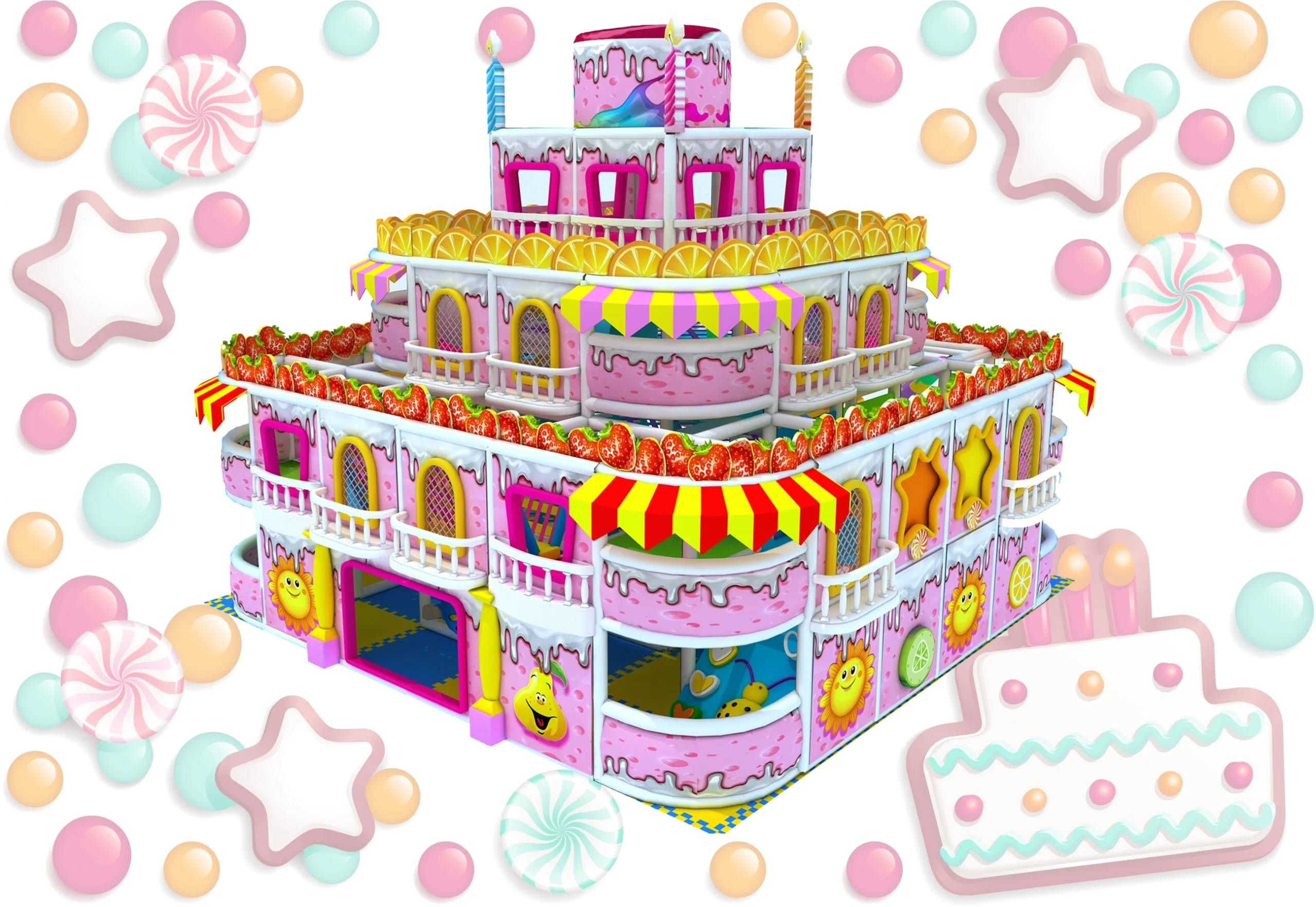Immersive Cake & Sweet Theme: A vivid 4-layer cake structure, decorated with strawberry, lemon, candy, lollipop and other cute food elements, creating a dreamy, fairy-tale play space that kids love.