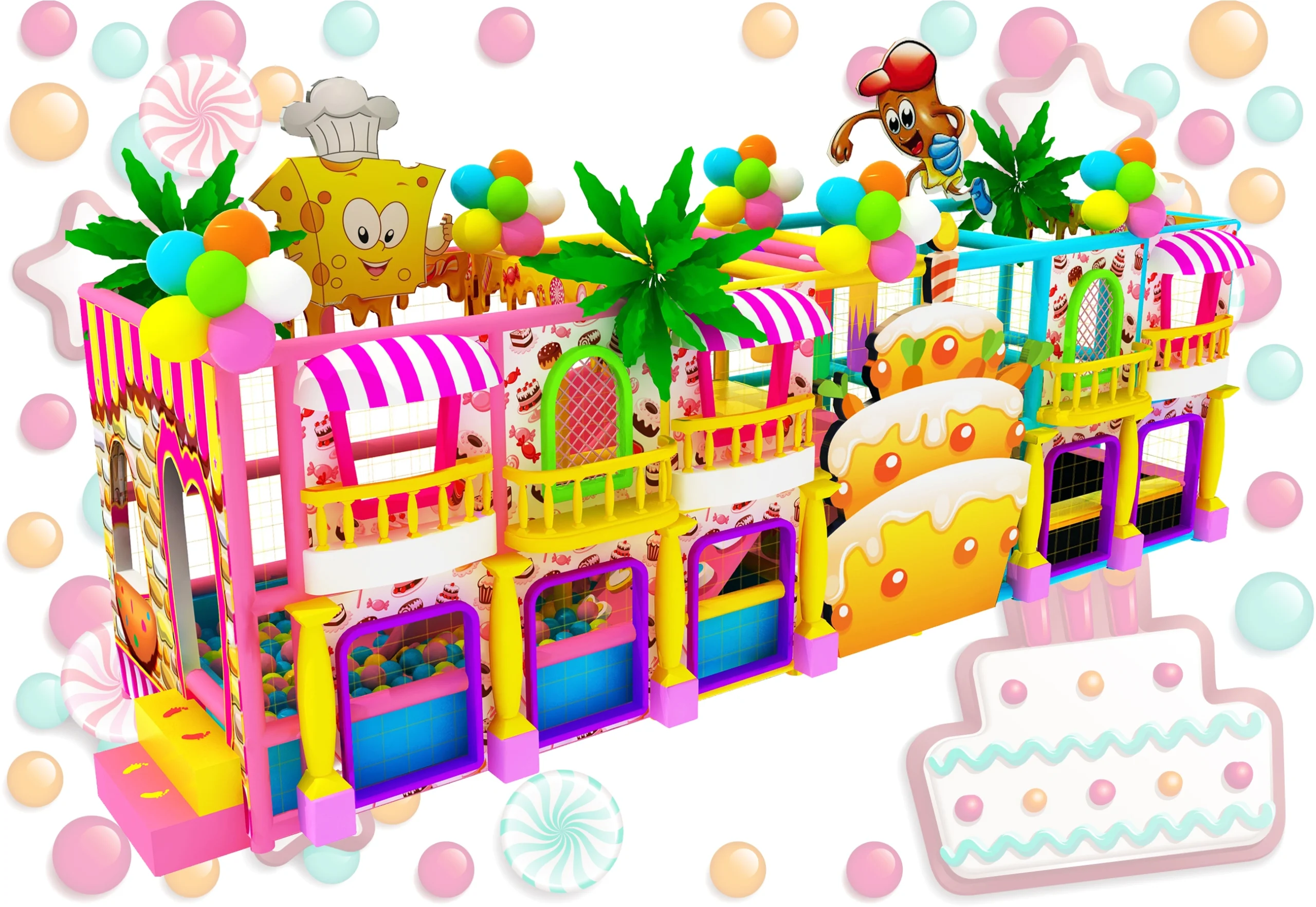 Immersive Candy & Sweet Theme: A vivid 2-layer cake structure, decorated with lollipop, ice cream, candy and other cute food elements, creating a dreamy, fairy-tale play space that kids love.