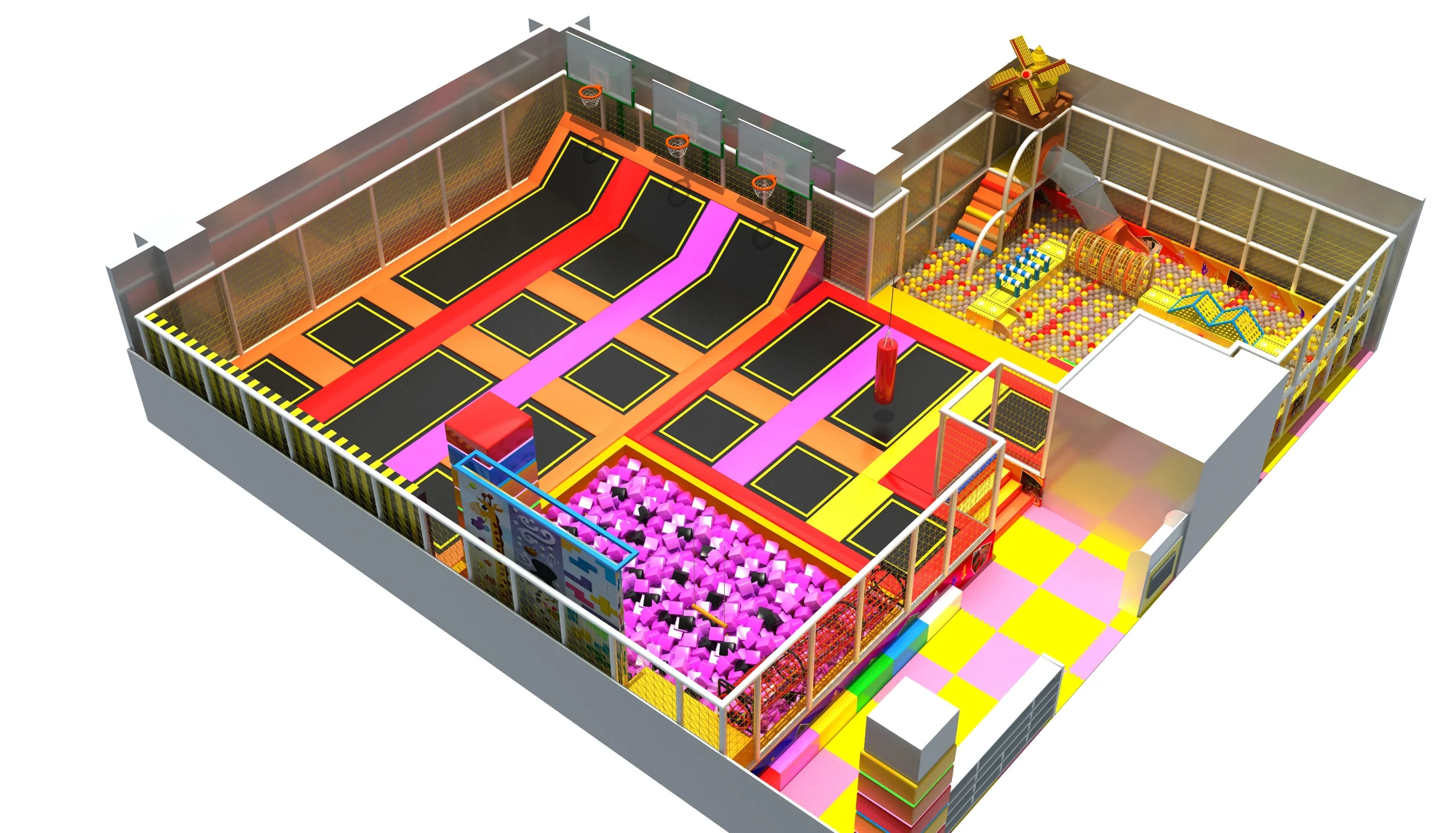 - Trampoline Zone: A bold, high-energy orange/pink/yellow color scheme for teens and adults, featuring professional-grade trampoline surfaces and basketball hoops.