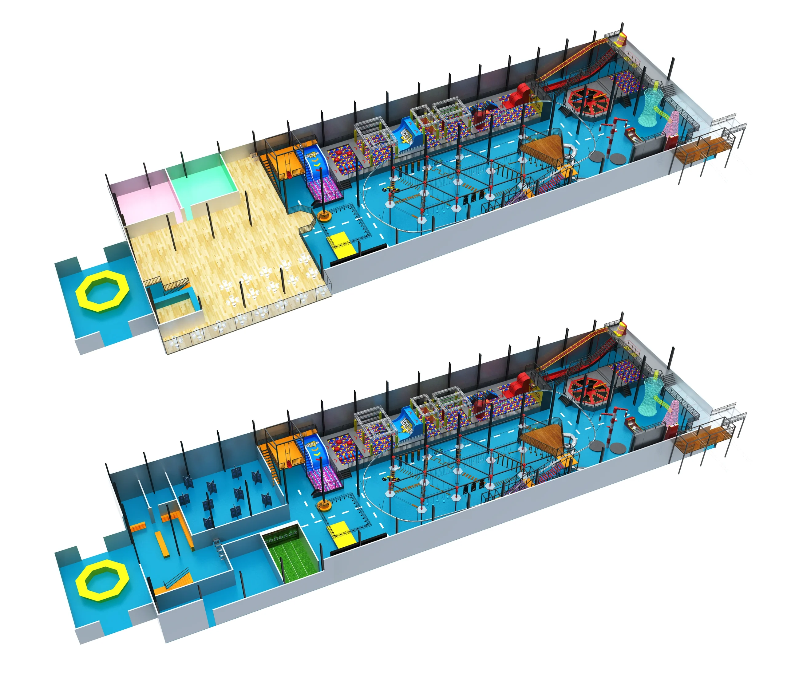 • Configuration B (Lower): Transforms the front area into a high-energy blue/black interactive sports zone with obstacle grids and precision challenge areas, ideal for teen and adult extreme sports.