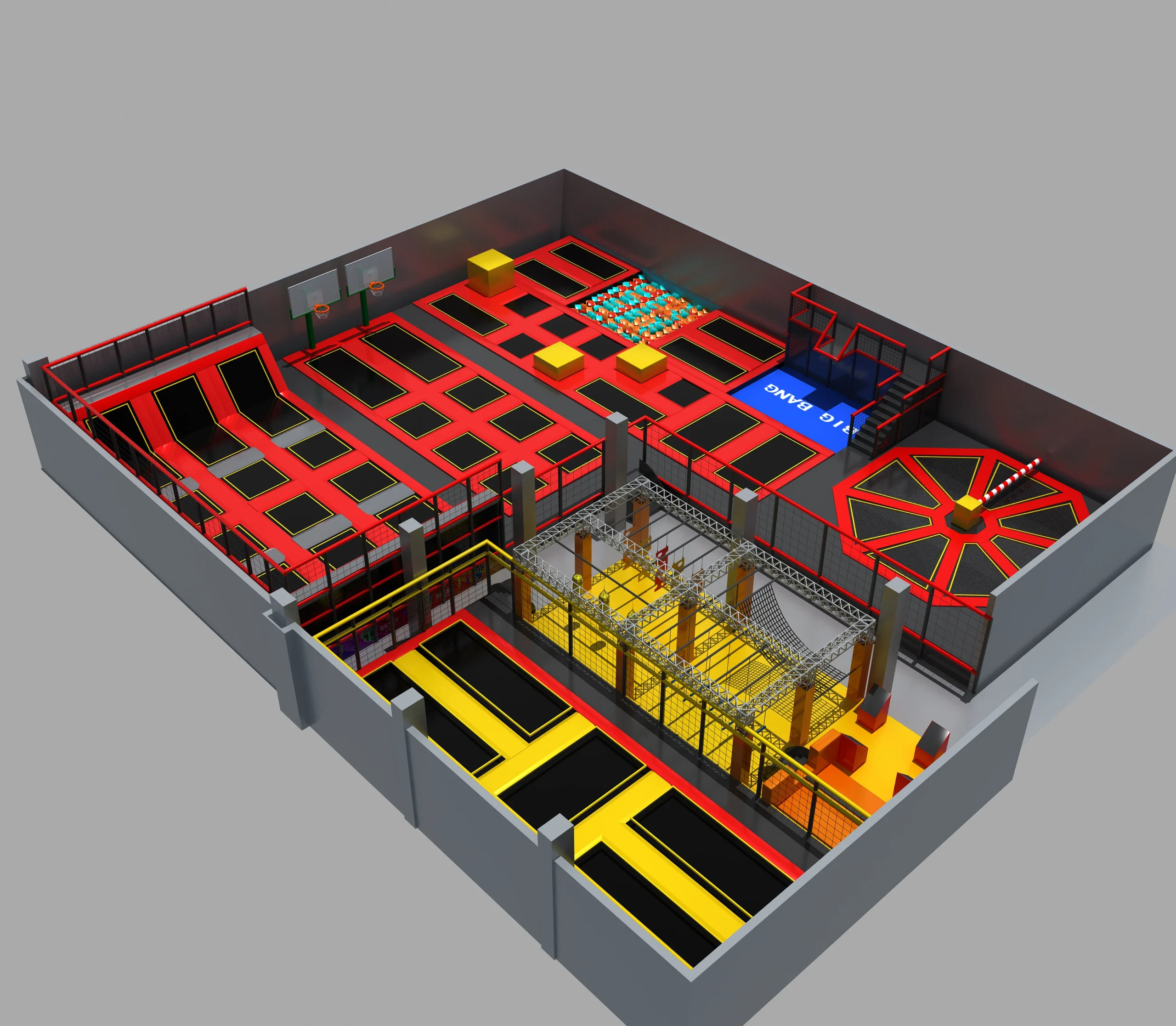 - Free-Bounce Trampoline Area: A large interconnected trampoline court for free jumping, flips, acrobatics and team games, maximizing space utilization.