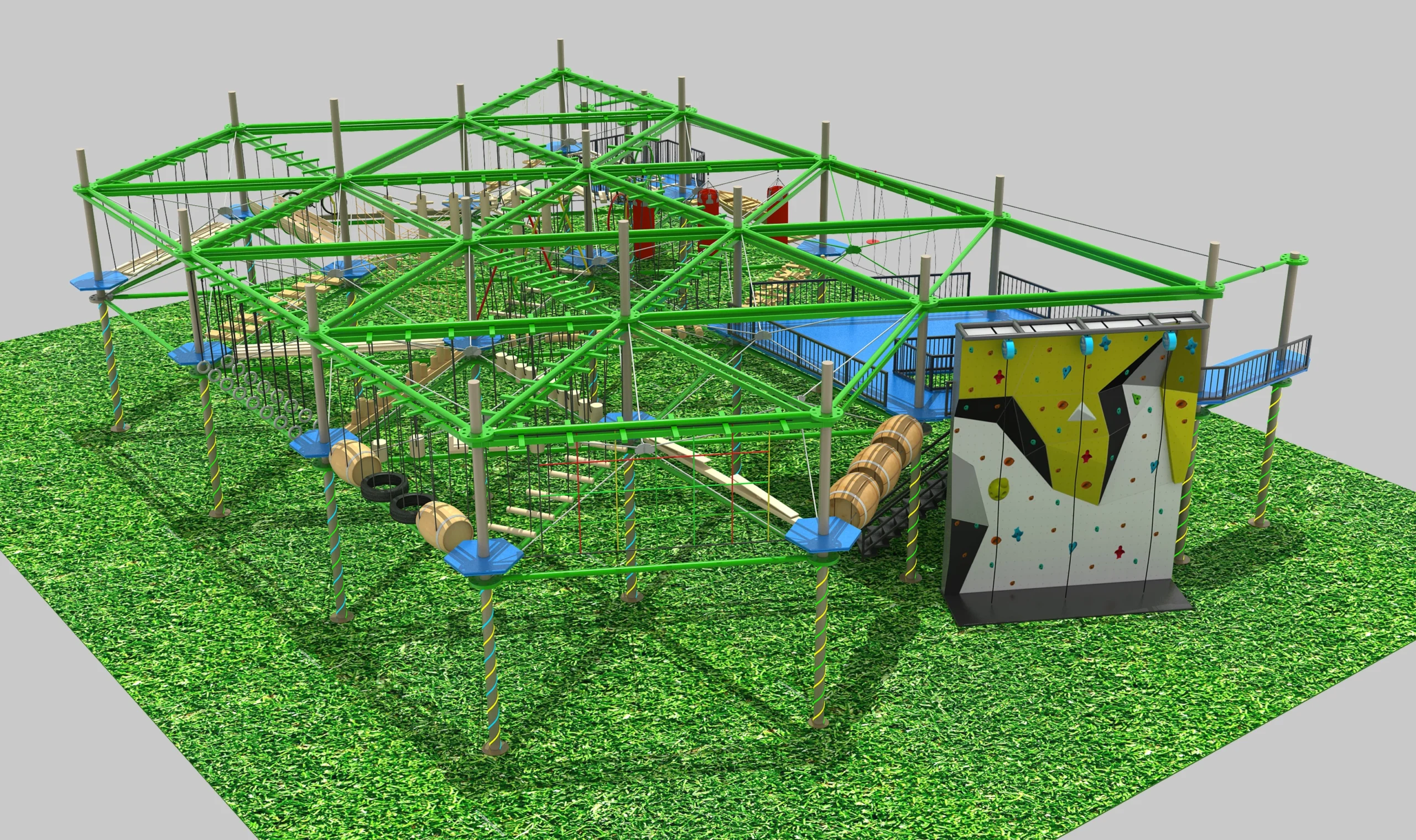 Green Frame Multi-Level Ropes Course with Climbing Wall: The Ultimate All-Weather Commercial Adventure Playground