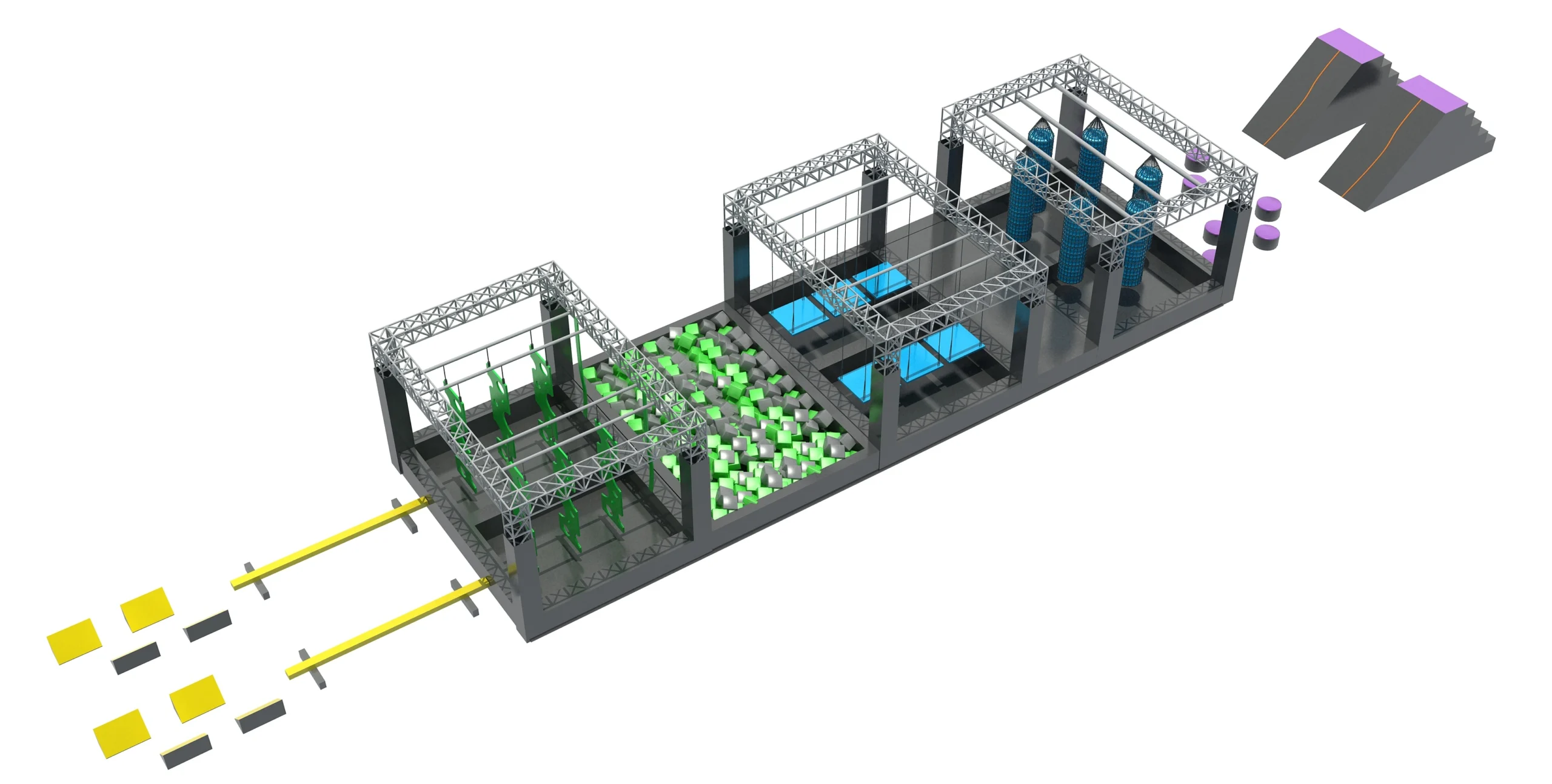 • Market Differentiator: The unique segmented modular design with foam pit safety zones sets your venue apart in a saturated market, creating a “must-visit” destination for active families and fitness enthusiasts.