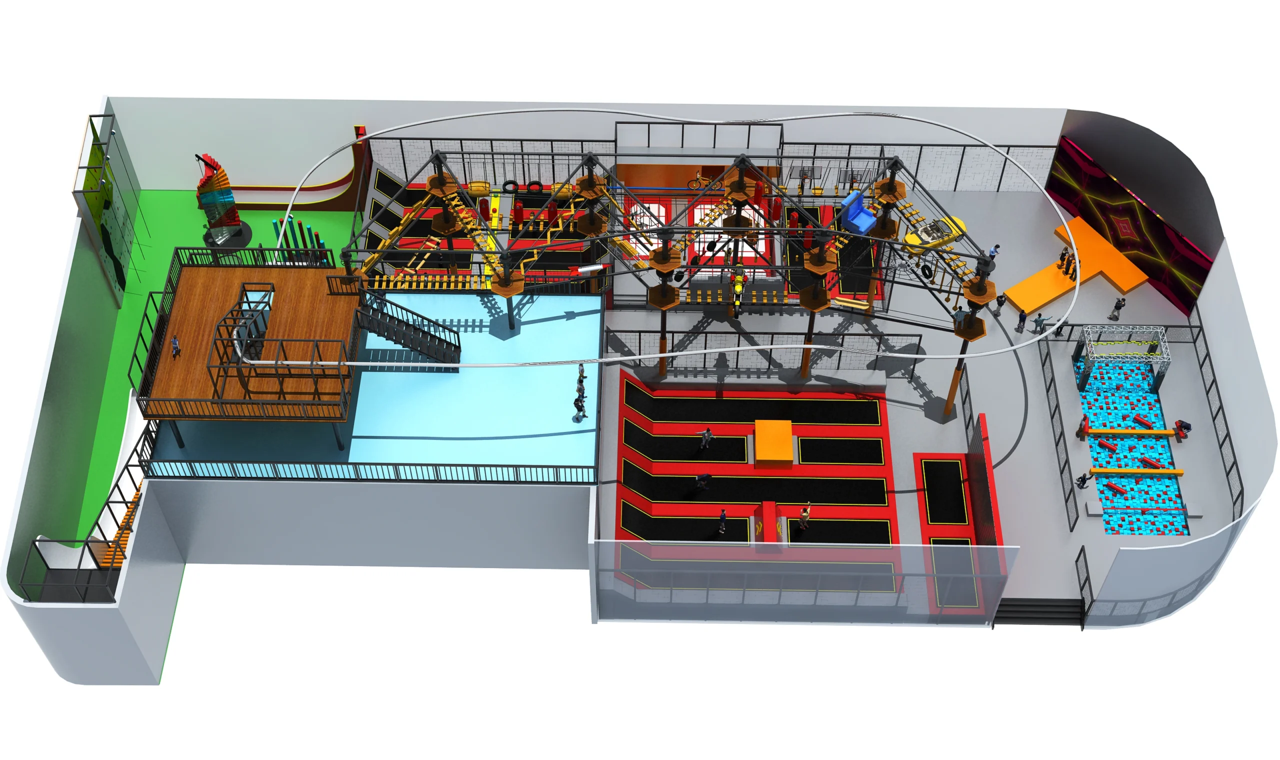Commercial sky rope course park with trampolines, foam pit & climbing wall. Safety-certified for malls & adventure centers. Boosts youth engagement & venue revenue.