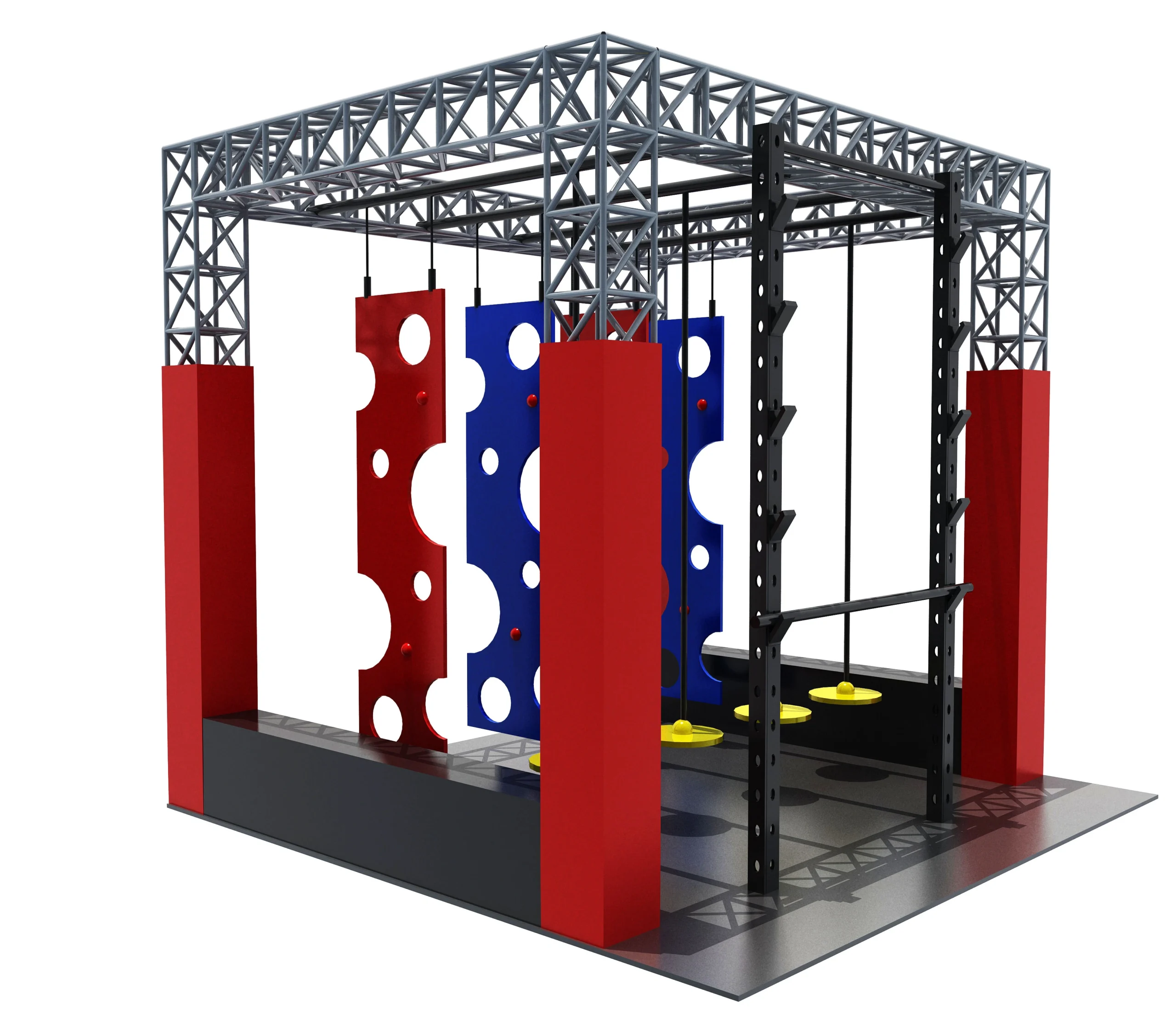 Diverse Ninja Obstacles: Red/blue climbing walls with circular cutouts, hanging yellow disc obstacles, black balance ladders, and multiple fitness challenges for varied skill levels