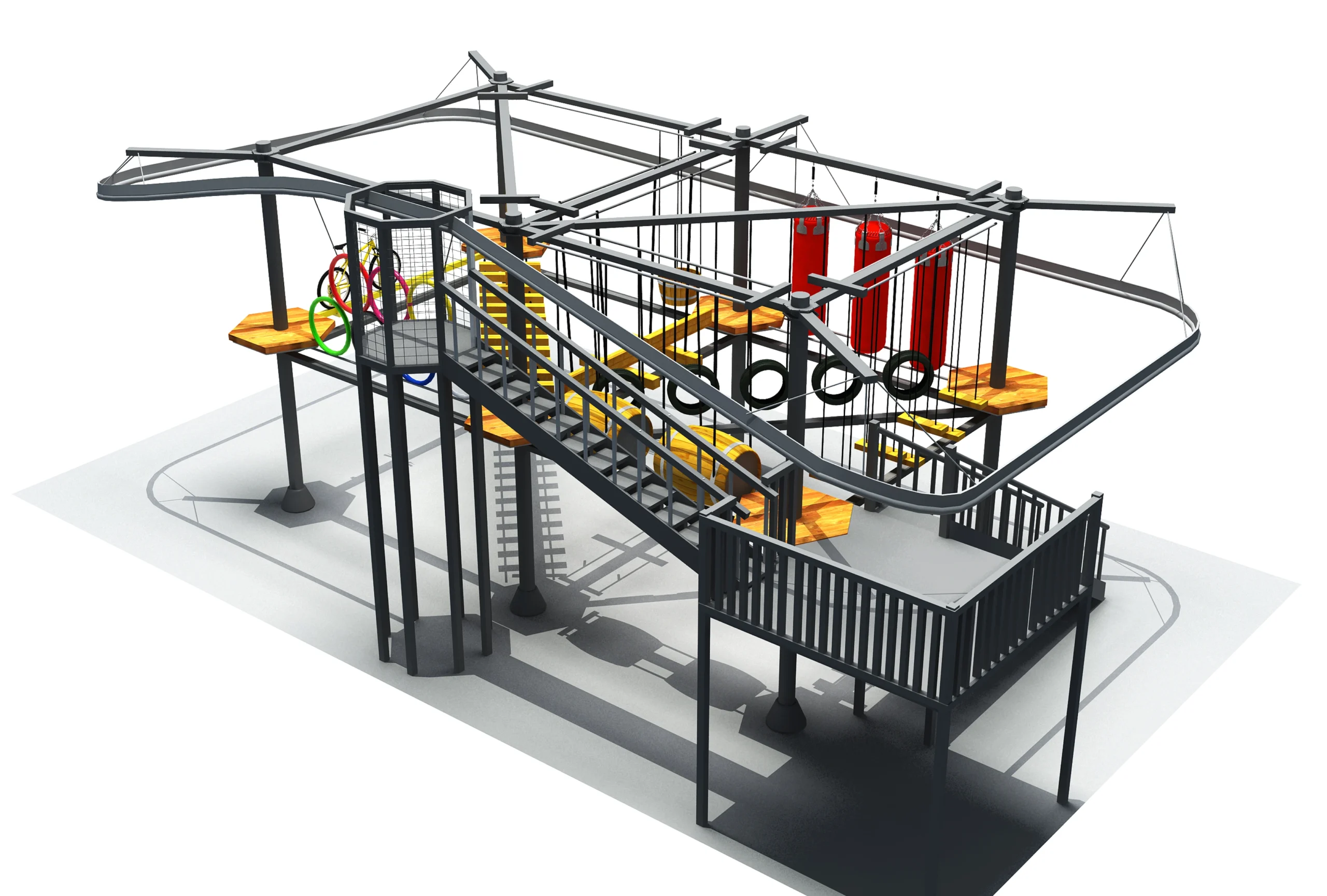 Commercial industrial-style multi-level ropes course with zip line, sky bike, and diverse obstacles. Safety-certified, fully customizable for FECs, malls, and adventure parks. Boosts engagement & revenue.