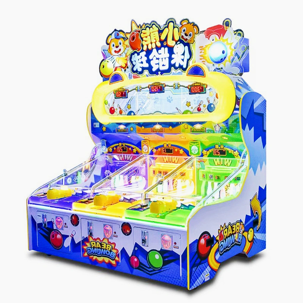 The Kuliku Lucky Bear Bowling offers an exciting ticket redemption experience where players insert coins to receive game balls and aim for different scoring rings using a pull lever.