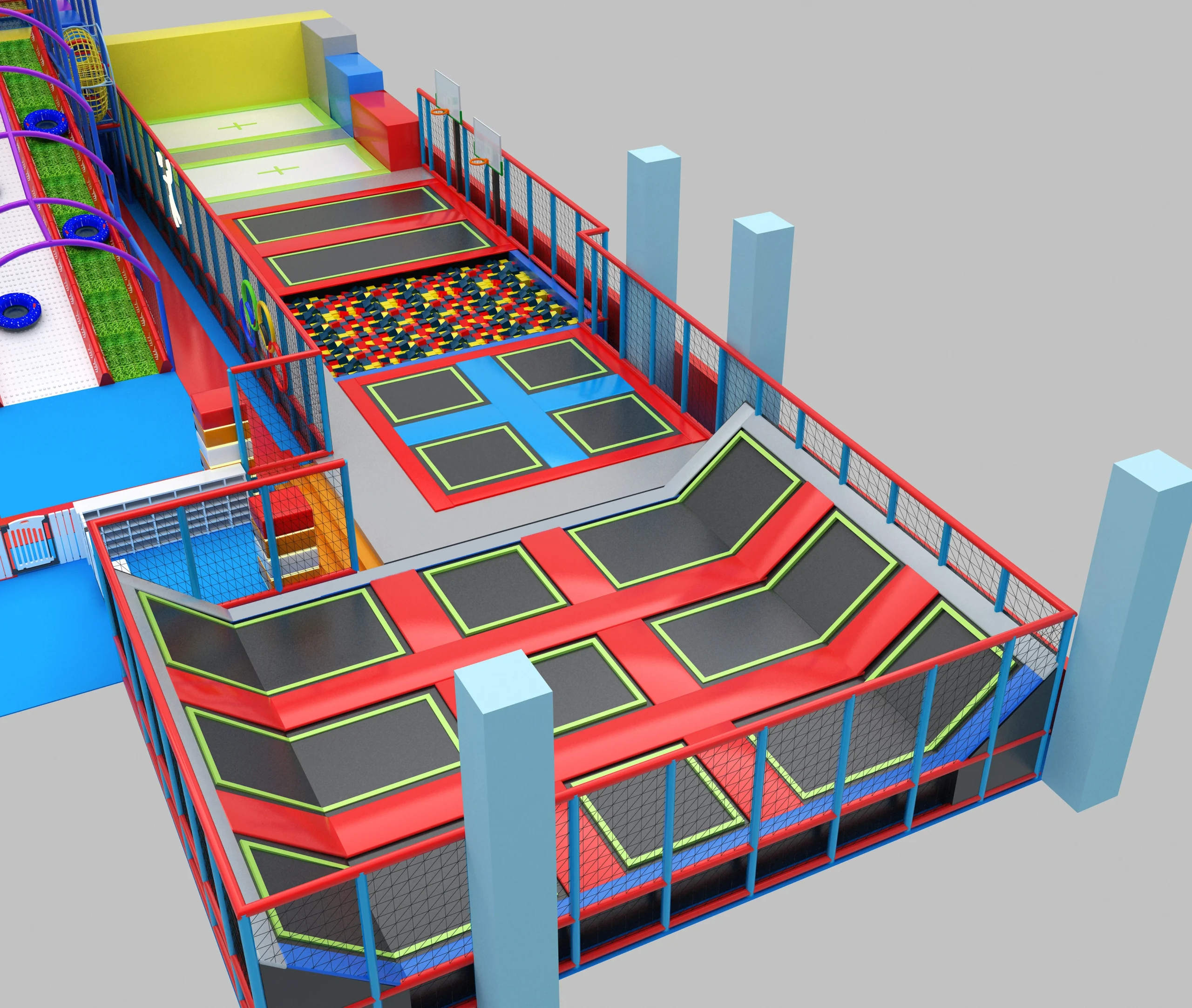 - Sunken Free-Bounce Trampoline Area: A large, recessed interconnected trampoline court for free jumping, acrobatics, and group games, providing a clear, open space for active play.