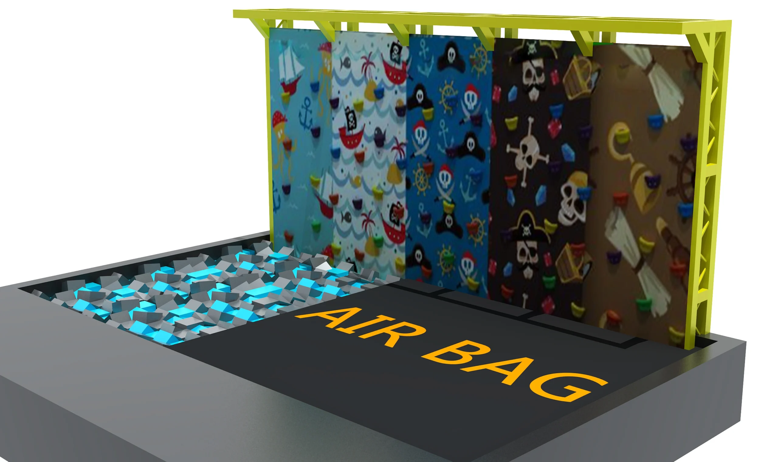 Our climbing wall stands out through its immersive design, child-friendly themes, and uncompromising safety standards: ✅ 5-Lane Free-Fall Design: Features 5 separate, side-by-side climbing tracks, allowing kids to climb and free-fall into the air bag, creating a thrilling, repeatable play experience that drives longer dwell time. ✅ Immersive Pirate Themed Tracks: Includes 5 age-appropriate, visually striking nautical themes: