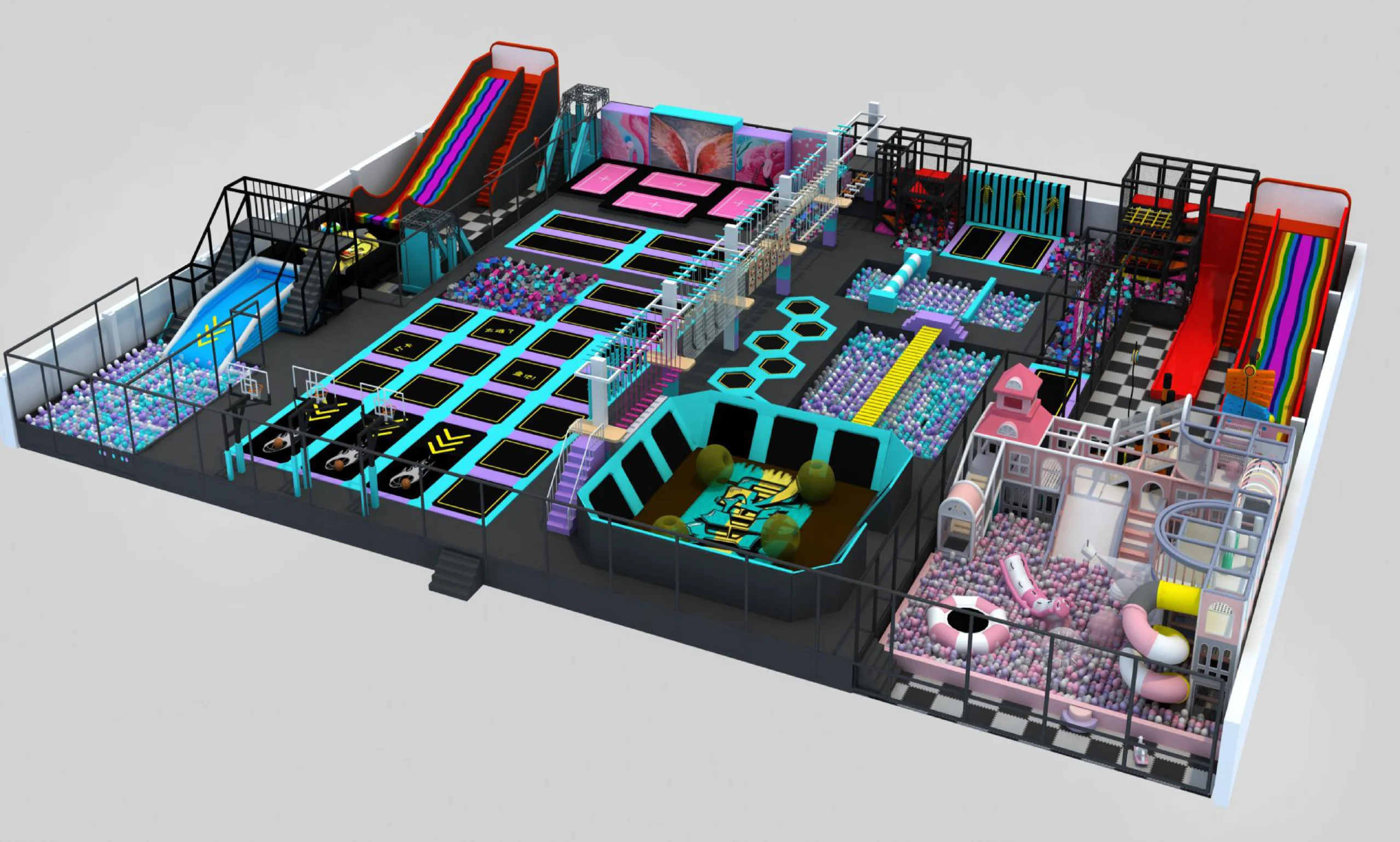 • Extreme Sports Zone: A bold purple/teal/black color scheme featuring professional-grade trampolines, honeycomb-shaped trampoline sections, and “BIG BANG” marked game zones, perfect for teens and thrill-seekers.