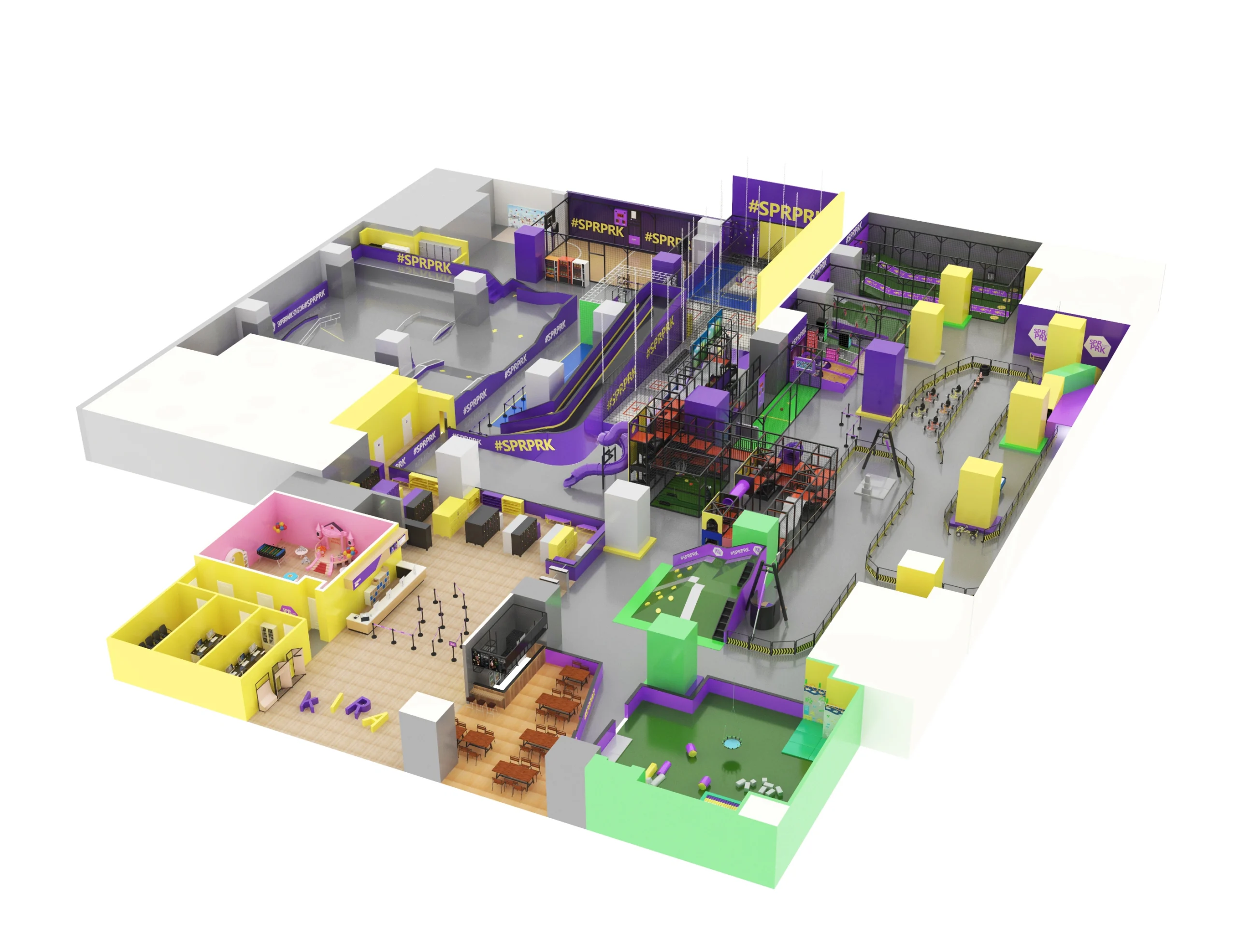 Immersive #SPRPRK Purple/Yellow Theme: Features a striking purple/yellow/black color scheme paired with bold #SPRPRK wall graphics and modern geometric decor, creating an energetic, contemporary environment that resonates with all age groups.