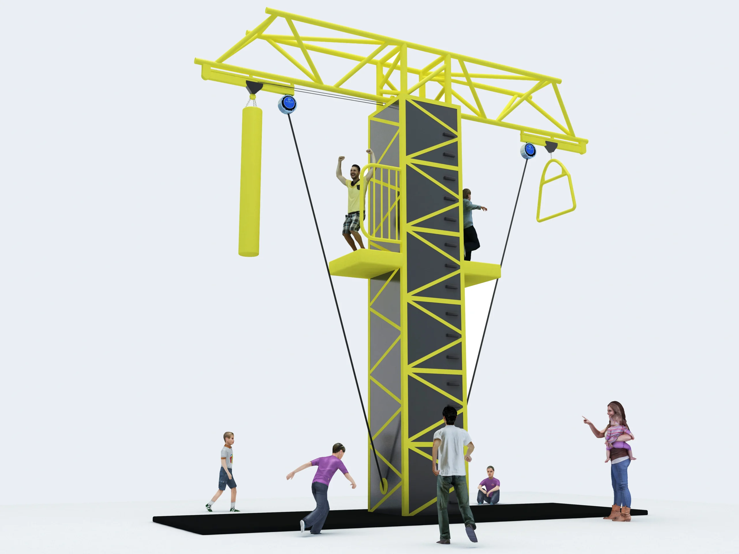 Our tower stands out through its industrial-grade engineering, multi-challenge design, and uncompromising safety standards: ✅ T-Truss Vertical Challenge Design: Features a robust yellow steel truss frame with dual vertical climbing walls, creating two parallel challenge tracks for head-to-head competitive races. ✅ Diverse High-Thrill Obstacles: Includes a suspended yellow punching bag for upper-body strength training, a trapeze swing for aerial challenges, and two professional zip line/auto-belay systems for fast, safe descents. ✅ Elevated Observation Platforms: Two spacious, fenced platforms at the top of the tower, perfect for rest, observation, or starting zip line descents, maximizing operational flow. ✅ Professional Auto-Belay Systems: Equipped with multiple digital auto-belay devices, ensuring safe, controlled descents for all users, eliminating the need for manual belaying and maximizing safety. ✅ Industrial-Grade Truss Frame: A heavy-duty yellow steel truss structure with gray accent panels, providing exceptional structural stability and load capacity for high-traffic commercial use. ✅ Global Safety Compliance: Built to strict international safety standards (ASTM F24, CE EN 1176, TÜV), with secure mounting and load testing for complete peace of mind. ✅ Fully Customizable Design: Tailor the obstacle mix, height, color scheme, and branding to match your venue’s theme and space constraints, with options for custom challenge configurations. ✅ Space-Efficient Commercial Construction: Designed to fit in a compact footprint, making it ideal for indoor adventure parks, FECs, and team-building facilities.